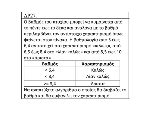 Να αναπτύξετε αλγόριθμο ο οποίος θα διαβάζει το βαθμό και θα εμφανίζει τον χαρακτηρισμό.