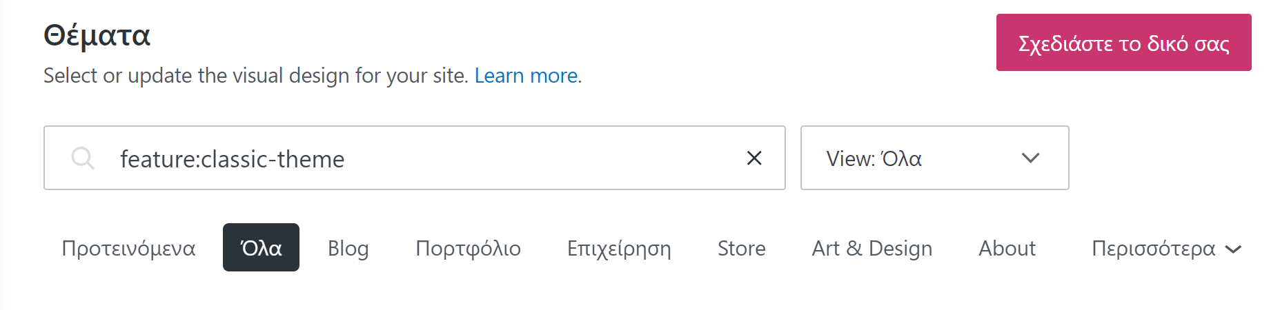 Για να εμφανιστούν θέματα που υποστηρίζουν την ξεχωριστή δημιουργία- επεξεργασία- ρύθμιση μενού πρέπει να δοθεί ως φίλτρο στην αναζήτηση το feature:classic-theme