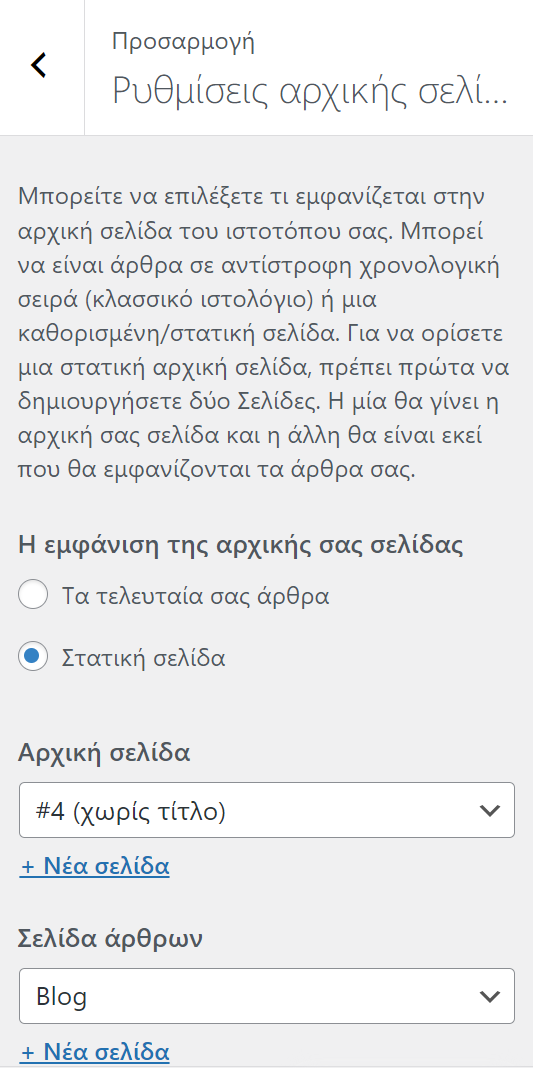Για να ορίσετε μια στατική αρχική σελίδα, πρέπει πρώτα να δημιουργήσετε δύο Σελίδες. Η μία θα γίνει η αρχική σας σελίδα και η άλλη θα είναι εκεί που θα εμφανίζονται τα άρθρα σας.